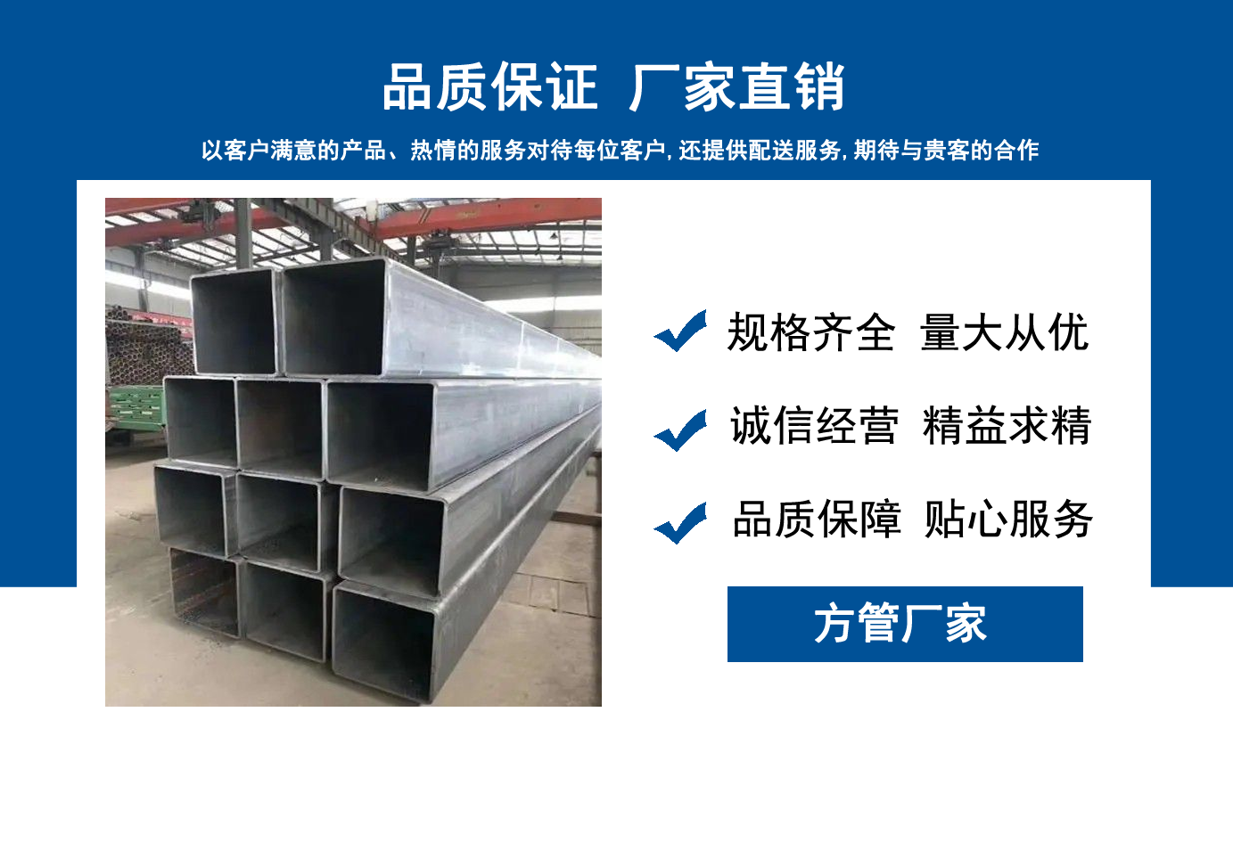 山東方管廠主要生產(chǎn)Q355B方管,Q355C方管,Q355D方管,Q355E方管,低合金方管等,曾多次為客戶解決了各種無縫管疑難問題,經(jīng)不斷的創(chuàng)新與努力,得到了客戶良好的信譽(yù)和稱贊?! 」颈匈|(zhì)量、服務(wù)是我們尋求發(fā)展的唯一途徑,為客戶提供極具市場競爭力的高品質(zhì)產(chǎn)品,愿與客戶一起進(jìn)步、共享成功! 我公司秉承“誠信經(jīng)營,服務(wù)周到”的經(jīng)營原則,全力以赴,給客戶周到滿意的服務(wù)?!罢\信、專業(yè)、認(rèn)真、服務(wù)”是我們的宗旨。幾年來我們用專業(yè)的技術(shù)和周到的服務(wù)贏得了廣大客戶和供應(yīng)商的信賴,與各大企業(yè)有著廣泛的合作和聯(lián)系,受到了業(yè)內(nèi)好評(píng)。我們會(huì)以優(yōu)良的產(chǎn)品、優(yōu)惠的價(jià)格、優(yōu)先的貨期、優(yōu)良的服務(wù),珍惜客戶給予我們的每一個(gè)機(jī)會(huì)。...